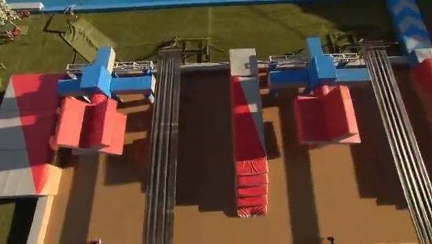 It is two rotating X’s that contestants must cross and land on the stretched trampolines to get to the other side. The speed of each spinning X is copied; depending on how fast they get on them will mimic their speed. A staircase is placed in between both sets, forcing them to climb up and attempt the second set if they fail to cross the first set.
