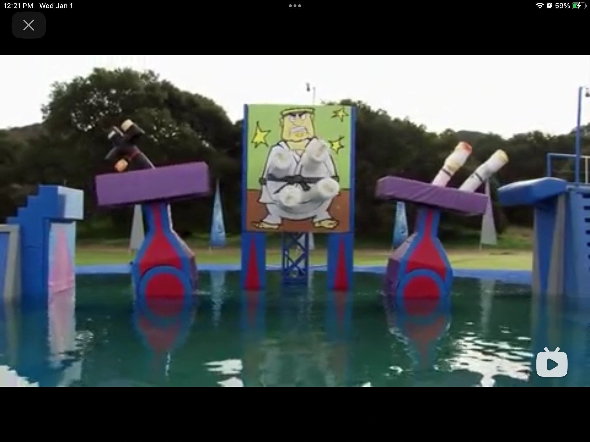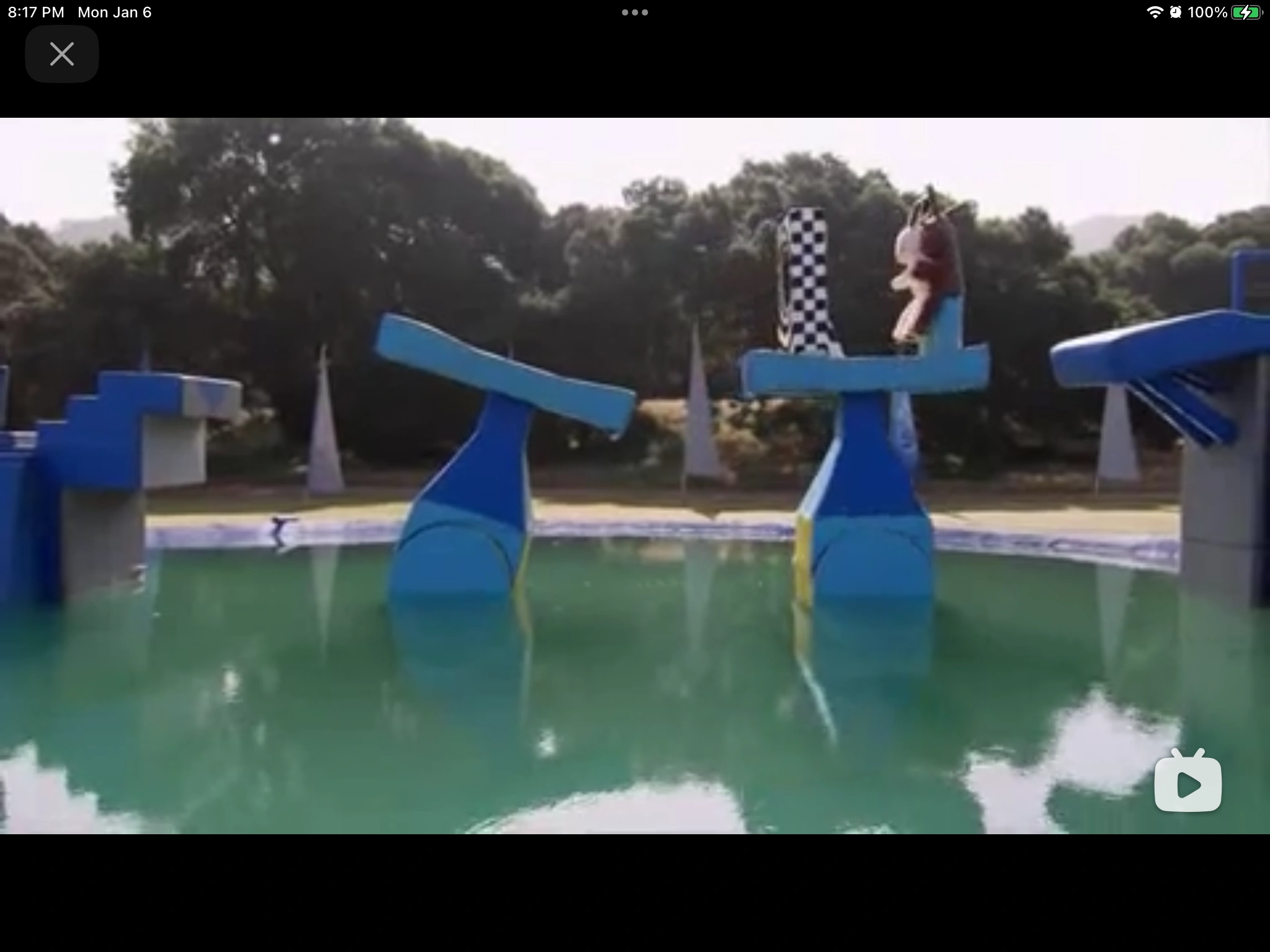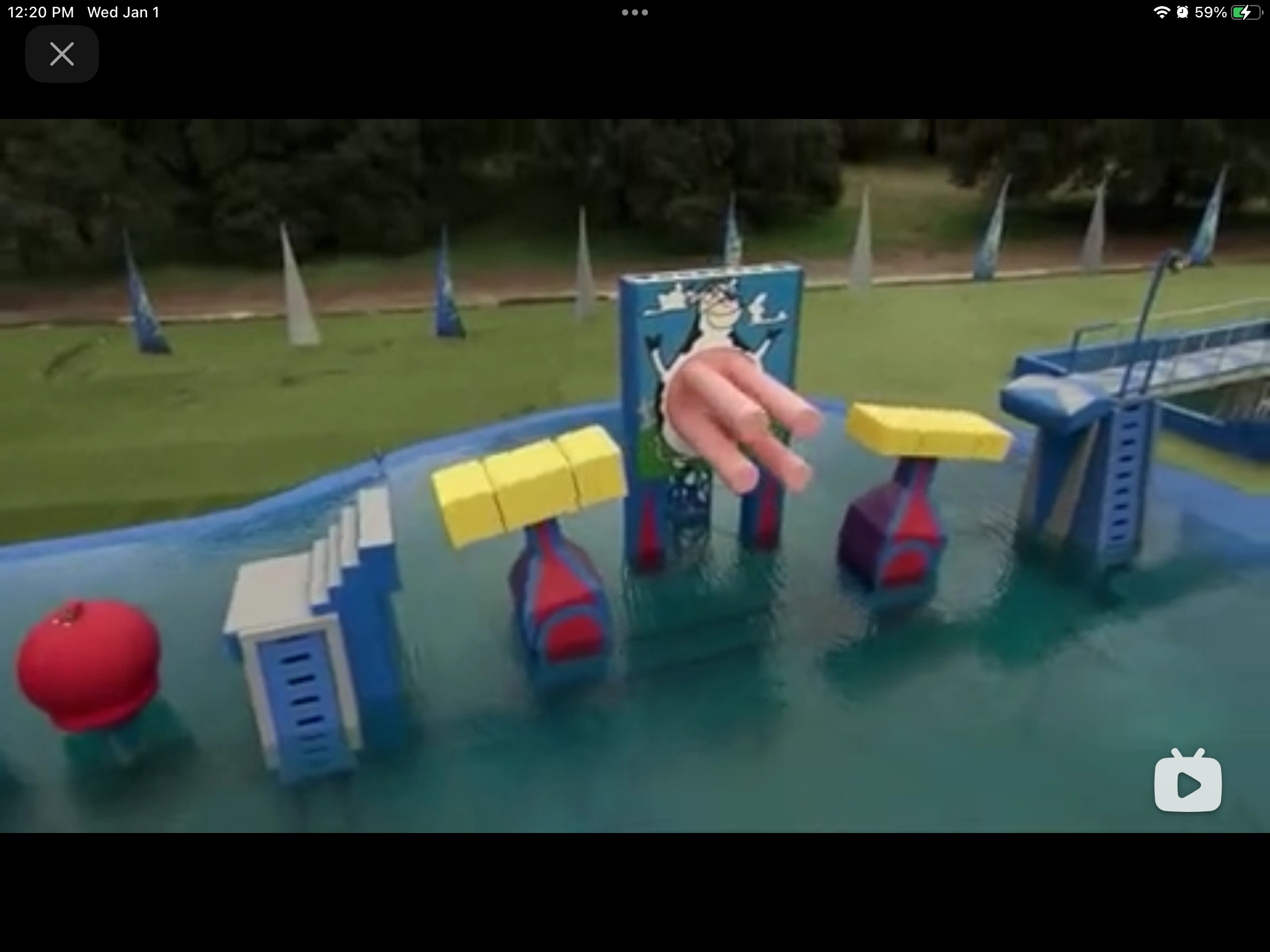 It is two shaking platforms that contestants must cross to get to the other side. It is unique in that like the Shake-a-lator, it toyed with a lot of people and made them jiggle. As soon as they attempt to jump from platform to platform, they move away. The second platform is usually dressed up in some way.