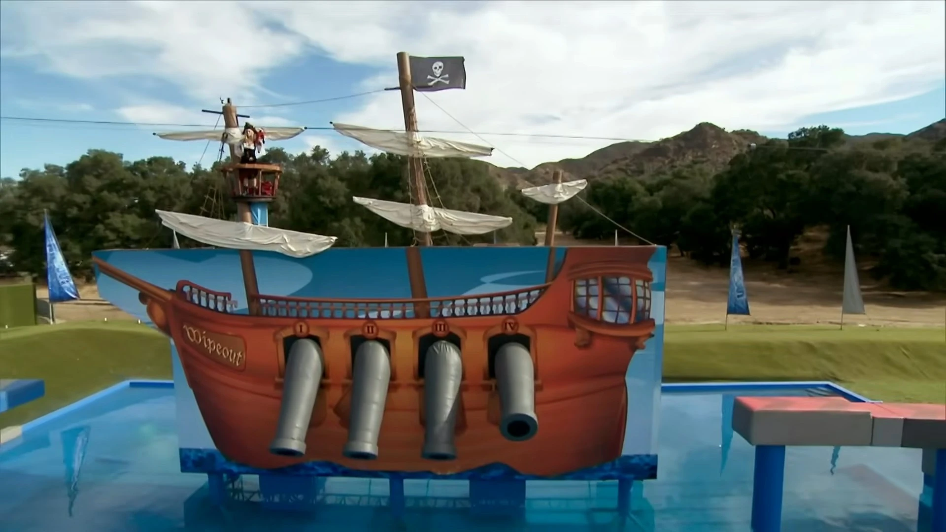 It is a pirate ship that contestants must swing across on a zip-line and over four cannons moving up and down while being blasted with water cannons and dealing with cannonballs and a pirate throwing parrots from above to get to the other side.